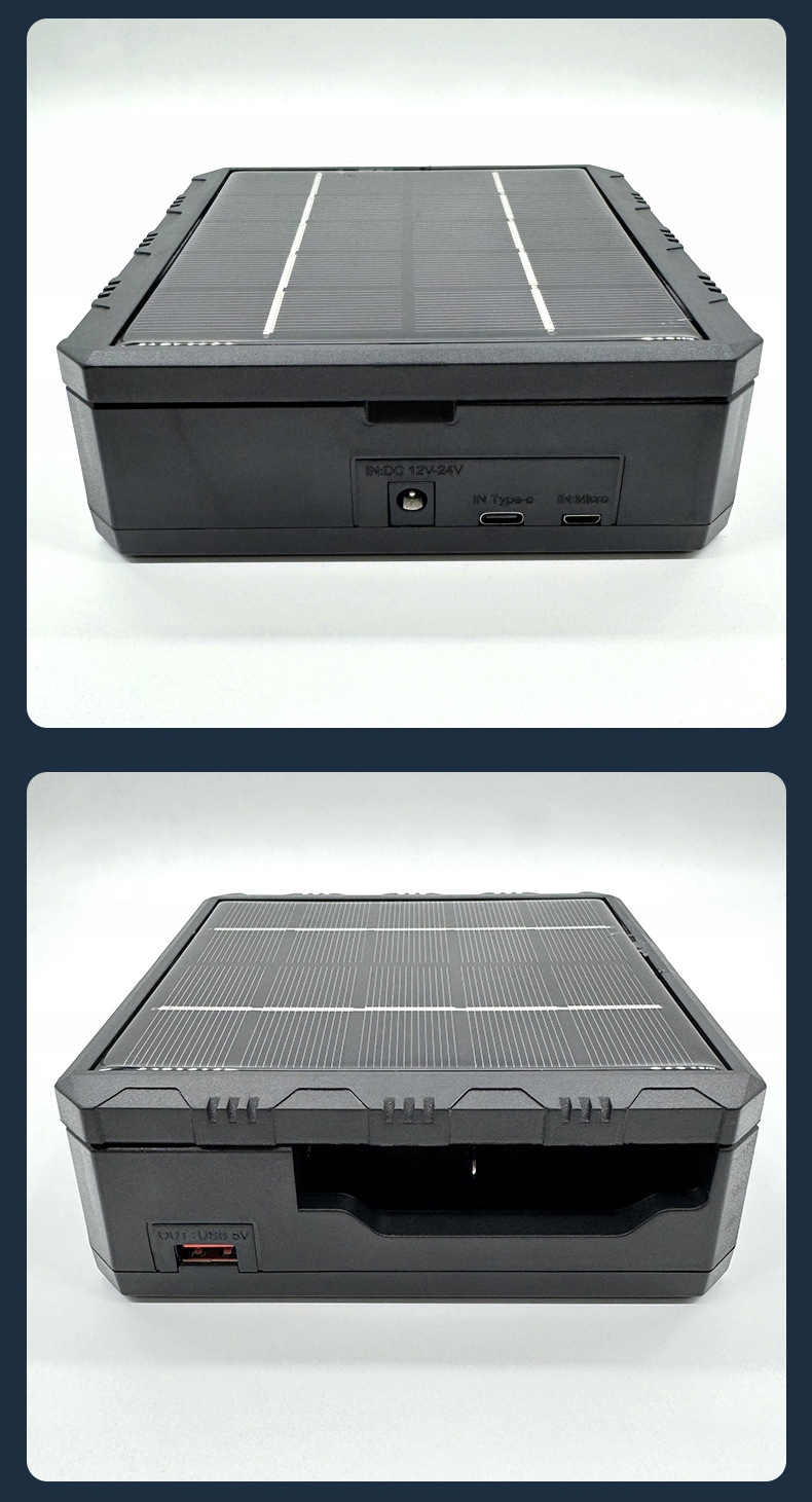 - Zasilanie: panel solarny, gniazdo DC 12–24V, micro USB, USB-C