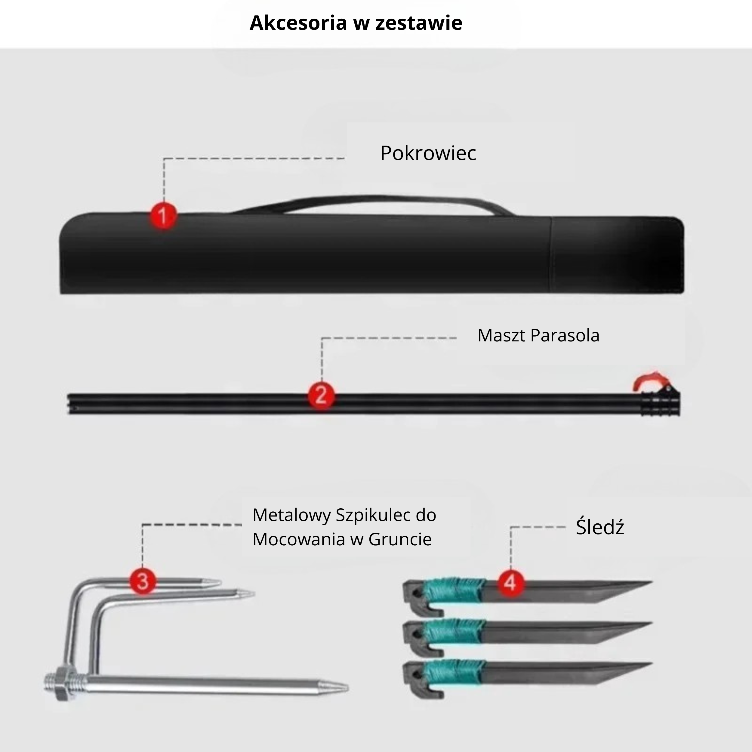 - Kompletny Zestaw Gotowy do Użycia: Parasol o średnicy 2,4 m, Metalowy szpic do wbijania w ziemię, 3x śledzie wiatroodporne, Wzmacniany pokrowiec transportowy z uchwytem