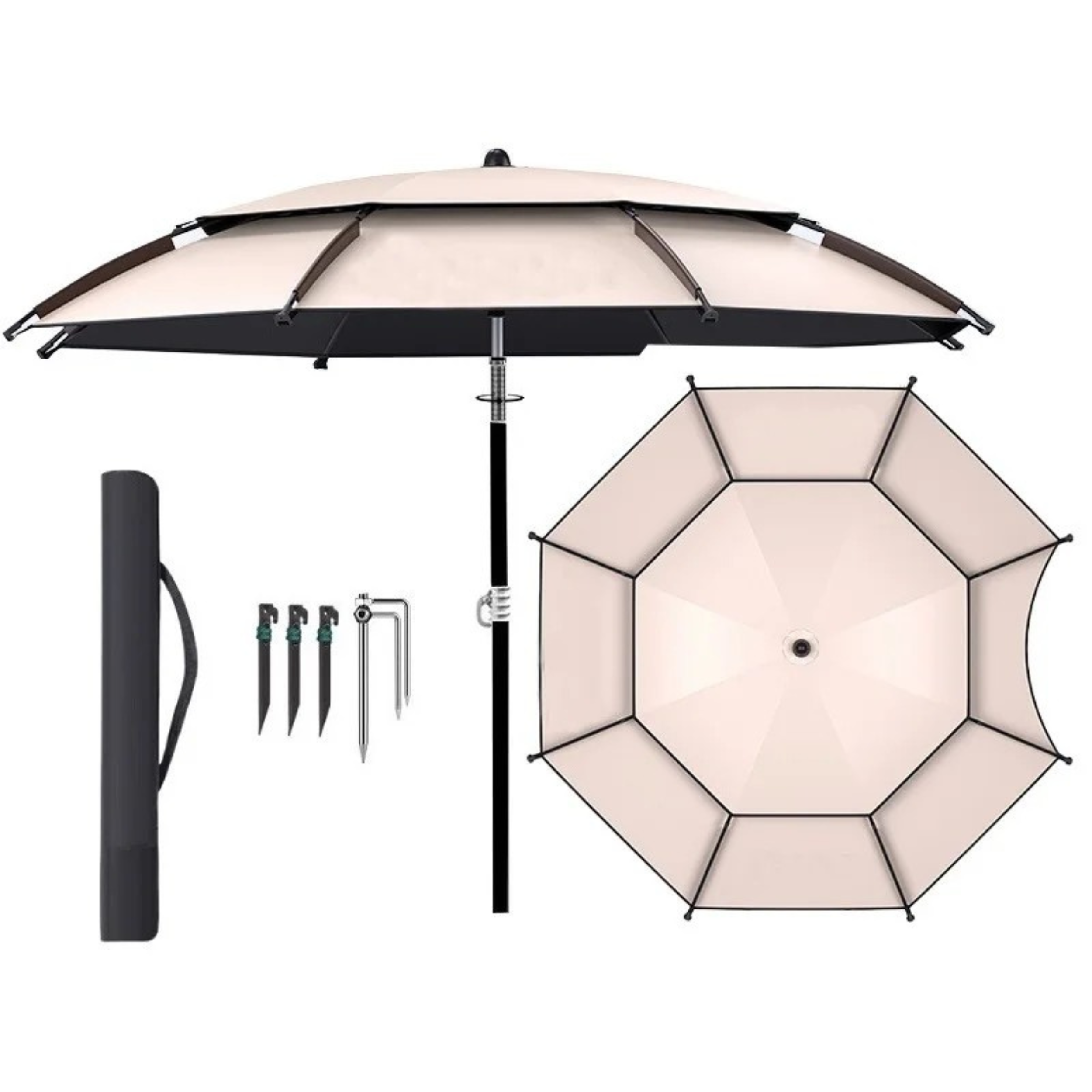 - Stabilność Nawet na Wietrze: 16 żeber z włókna szklanego, wzmocniony maszt i dwupoziomowy daszek wentylacyjny zapewniają wysoką odporność na silny wiatr. Możliwość zakotwiczenia parasola śledziami.